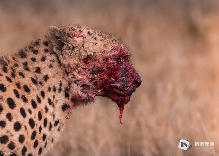 ‘The Murderous Pharaoh’ – a member of the famous cheetah coalition of five, Tano Bora, in the middle of a zebra meal. Maasai Mara National Reserve, Kenya. © Aditya Nair