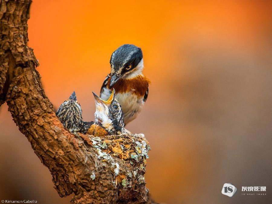 A female chinspot batis feeds its demanding chicks in their perfect little nest. Kolwezi Lualaba Province, Democratic Republic of the Congo. © Kirkamon Cabello
