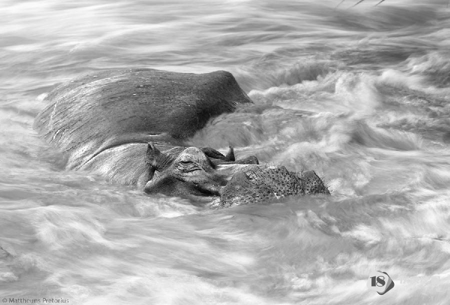 A hippopotamus enjoys sleeping in a natural jacuzzi. Sabie River, Kruger National Park, South Africa. © Mattheuns Pretorius