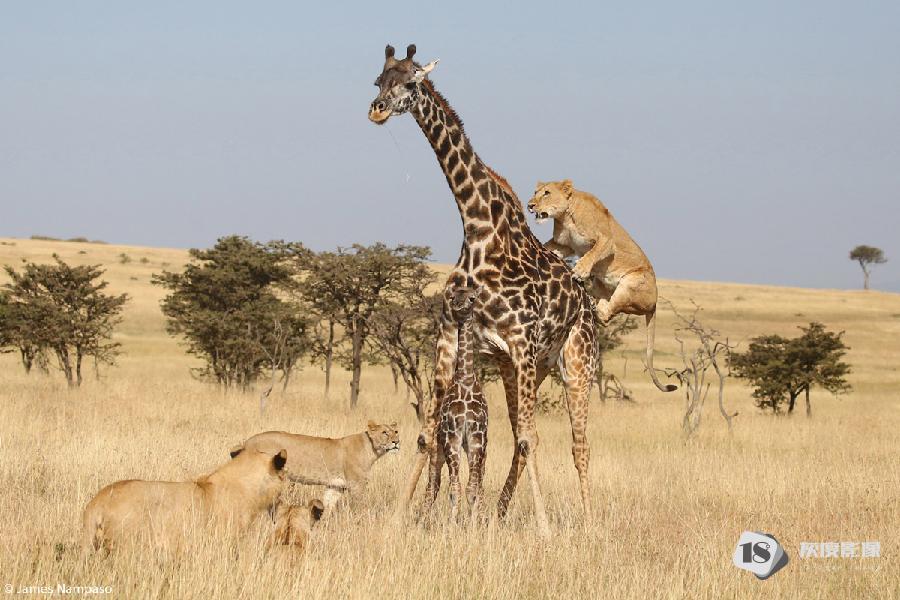 Attack – a pride sets upon a giraffe cow and her helpless calf. Olare Motorogi Conservancy, Kenya. © James Nampaso