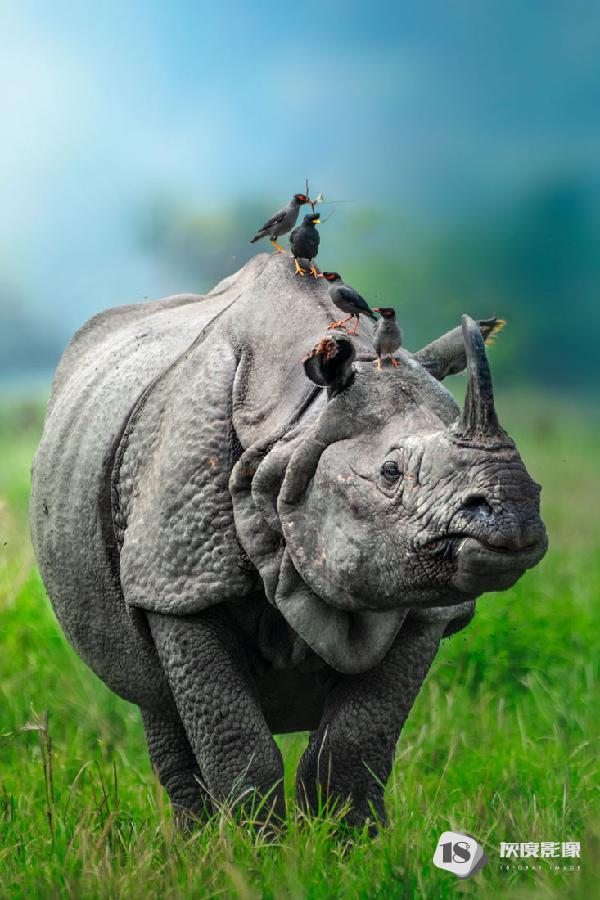 ONE HORNED RHINO WITH MYNA