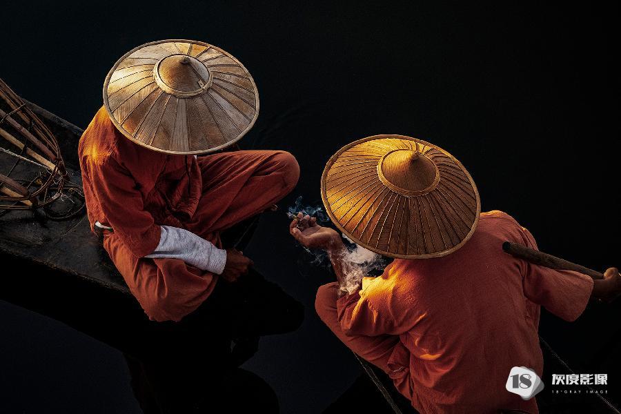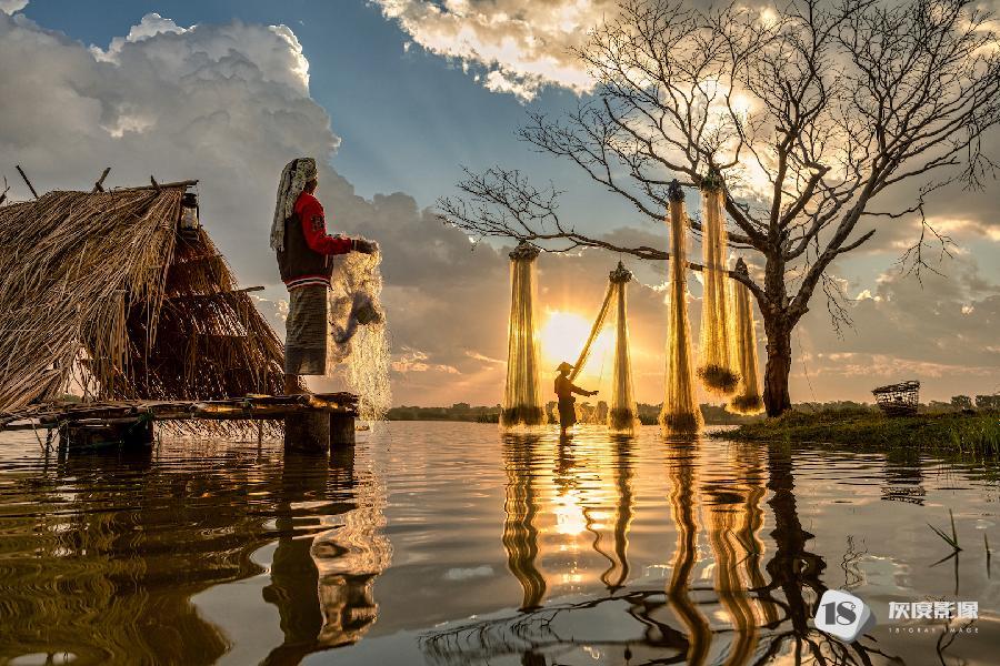 一个渔夫和他的妻子在湖边工作,用传统的方法捕鱼。