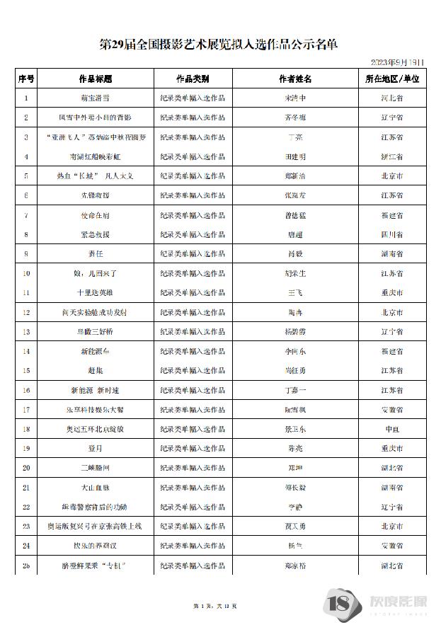 由中国文学艺术界联合会、中国摄影家协会主办的第29届全国摄影艺术展览的评选工作已经结束。根据征稿启事相关规定,本着公平、公正、公开的原则,现将本届展览全部拟入选作品予以公示。公示时间:9月19日至9月25日(24:00结束)共7天。