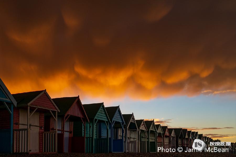 Overhead Mammatus over Beach Huts at Herne Bay©Jamie McBean,英国